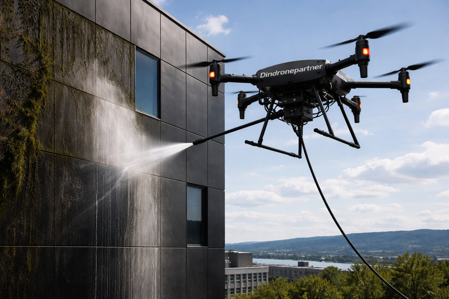 Med vår avanserte dronevask-teknologi kan vi nå tilby en ny og mer effektiv løsning for rengjøring av bygg. Vi har en av Norges største droner, utstyrt med høytrykkspyler som effektivt kan fjerne skitt, alger og annen forurensning fra både fasader og tak. Dette gir en rask, sikker og kostnadseffektiv vask, spesielt for høye bygg eller vanskelig tilgjengelige områder.